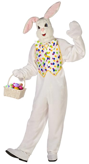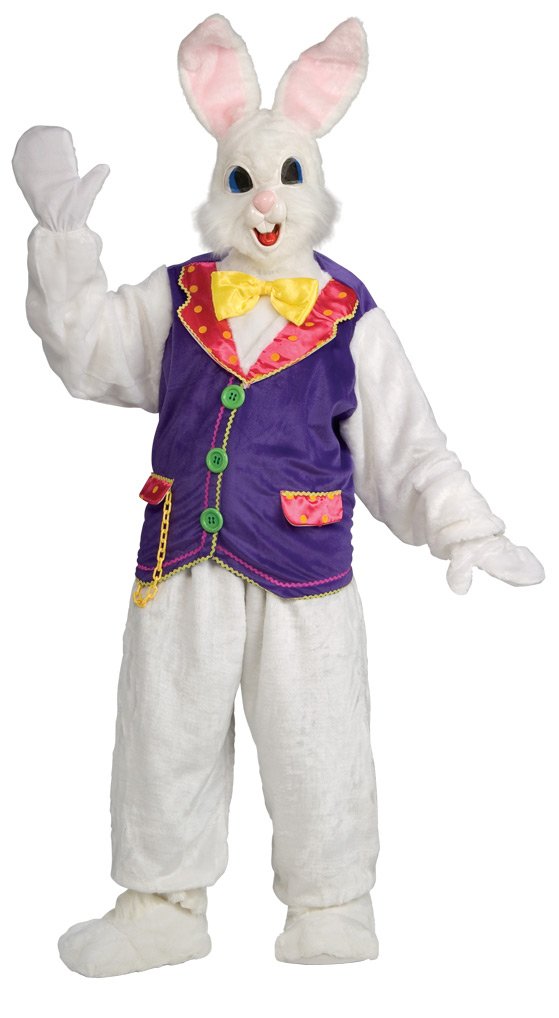 This Economical but Deluxe Easter Bunny Plush Jumpsuit comes with Mascot Head and Open Face Overhead Mask with Plush hood and soft stand up ears, gloves, printed vest, bow tie and plush feet. Makeup and Easter basket not included.